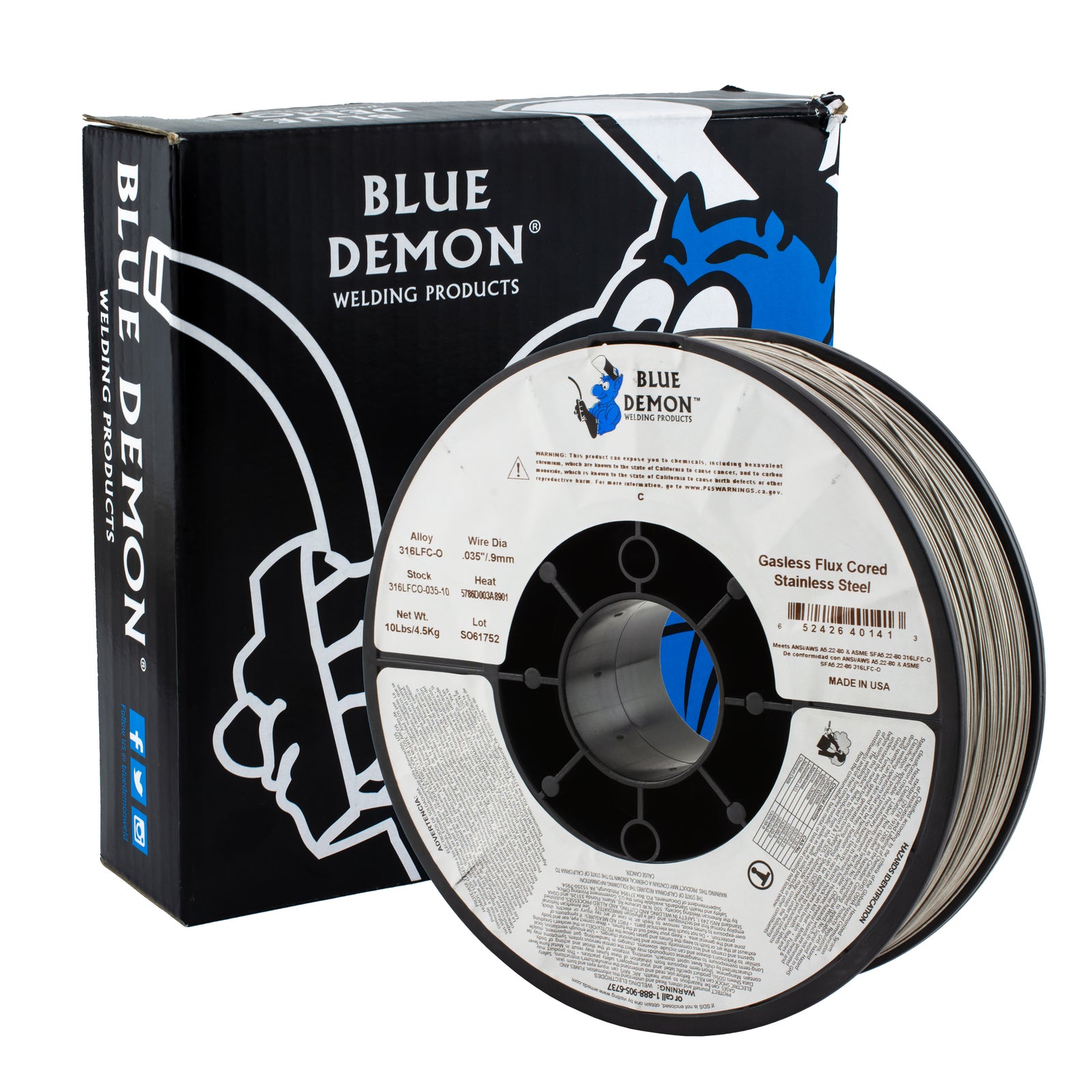 Blue Demon - 316LFC-O Gasless Welding Wire is a self-shielding flux core version of solid ER316L stainless steel welding wire. It has a low carbon content and is used for welding type 316 series stainless steel.